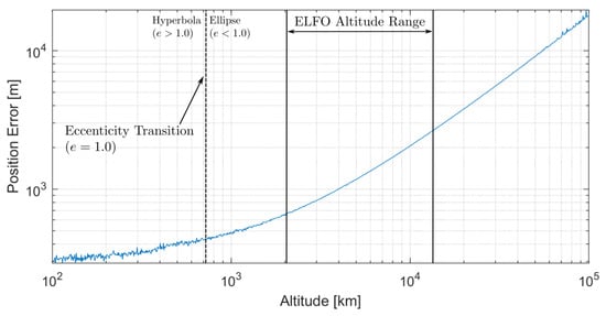 In Figure 4, the ELFO orbital altitude range is indicated from 3026 km to 10,210 km. The transition between a hyperbolic and elliptical projection is also highlighted, and it does not fall within the orbital altitude range of the ELFO, occurring at 707 km.