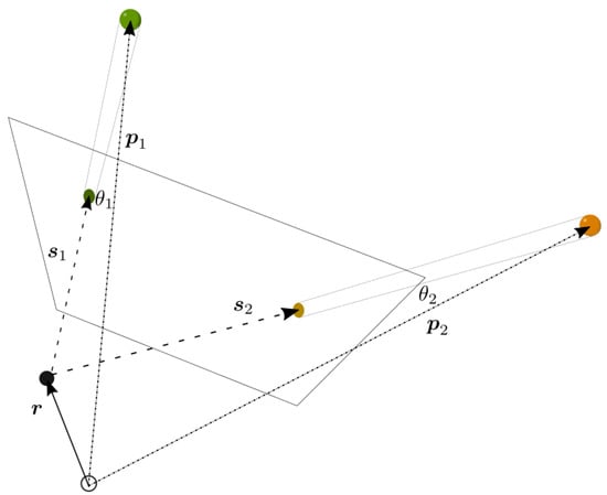 A representation of the celestial sphere through an AOA approach is illustrated in Figure 5. The celestial body position is located at and the observing vector at . A familiar relation can then be established, , as in the case of the horizon. The angle of arrival can be calculated from the dot product relation, . This relation is used by [41].