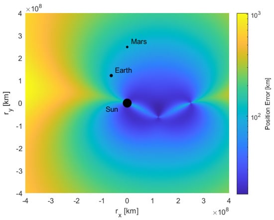 The DOP, and thus calculated position error, can be considered in the solar system plane. In Figure 6, the Sun, Earth, and Mars are treated as an observed distant celestial source at a position . In this example, the sources are placed in one quadrant of the solar system plane, with the Sun at the centre. For a spacecraft at some position in the plane, the expected position error may be estimated by first calculating the DOP from Equation (11), and then the position error by Equation (9).