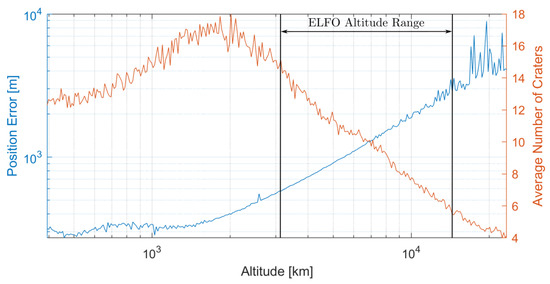 From Figure 4, altitudes beyond the ELFO operating range appear unsuitable for this application using horizon-based navigation, moving towards accuracies of more than 3 km. Within the operating range, performance varies between approximately 650 m and 3 km. It is suspected that this is caused by changes to the visible length of the lunar limb, with a constant camera resolution, at various distances from the surface. At altitudes below 300 km, the horizon approach plateaus as meaningful curvature information is no longer measurable. Results below 100 km have been omitted for this reason.