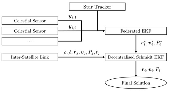 - Qin, T.; Macdonald, M.; Qiao, D. Fully Decentralized Cooperative Navigation for Spacecraft Constellations. IEEE Trans. Aerosp. Electron. Syst. 2021, 57, 2383–2394. [Google Scholar] [CrossRef]