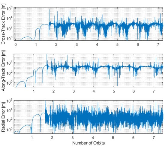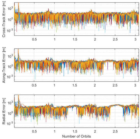 Performances with a fused horizon and crater-based filter are also highlighted in Table 3. The performance overall is worse than the horizon-only model, which is most likely caused by the high variability in crater performance to altitude. The crater technique is worse in the radial direction than on the cross- and along-track, which also affects the combined solution. Interestingly, the precision is much stronger using the combined measurements, indicating that any solution bias is reduced. This makes sense as the crater technique uses points over a wider geometrical spread than the horizon, which is restricted to the Moon’s corners.