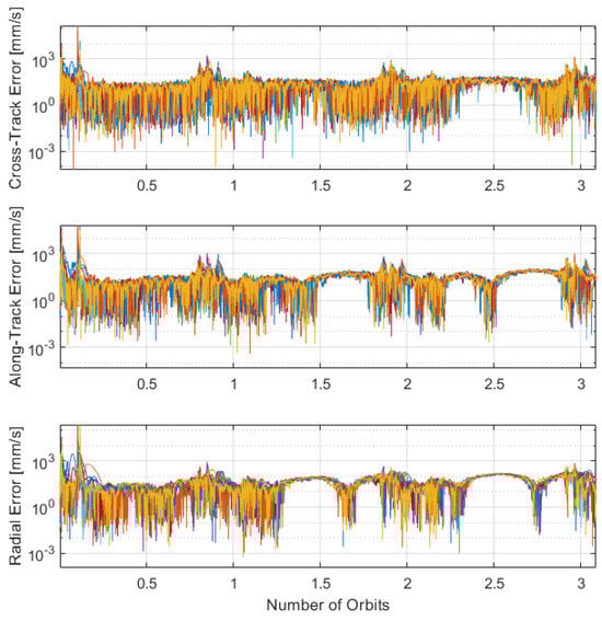 The ISL can support with performance, which is able to provide a relative measurement to the neighbouring satellite’s range and range-rate. This technique may only be used in combination with other celestial sensors, which provide an absolute position reference to the Moon. The performances of the EKF methodology are presented in Table 4 as an average of all ten satellites, alongside a plot of performance over time of the position and velocity errors in Figure 13 and Figure 14 respectively. A horizon-only approach is treated since it delivers the best performance in Table 3.