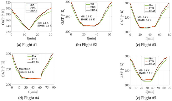 Additionally, the FDR data did not directly provide the Mach number. Still, using the ground speed V g and available FDR wind heading and wind speed information, we calculated the true airspeed necessary for fuel flow estimation. The outside air temperature T is calculated from the energy equation for adiabatic flow (Equation (1)), using the measured total air temperature T 0 and calculated airspeed.