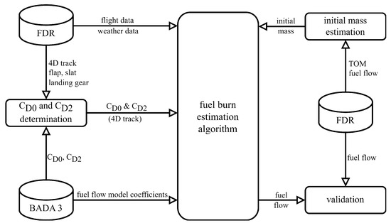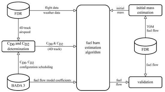 Chatterji et al. improved the method in [7] by deriving a fuel estimation procedure from nonlinear equations of motion with point-mass assumption instead of the approximations introduced in [6]. Accurately evaluating the fuel consumption rate requires knowing the aircraft’s initial weight. The method for estimating aircraft and wind states using proportional–integral–derivative (PID) filtering and the procedure of initial weight estimation is presented in [7]. Chatterji et al. [7] used Bombardier Global 5000, while Oaks et al. [6] used CRJ900 aircraft to validate the method using FDR data for a single flight. The paper by Chatterji et al. [7] used BADA flight phases to determine configuration changes. The authors managed to estimate fuel burn from a single flight with accurate initial mass with less than 1% estimation error after adjusting BADA drag coefficients to minimize the error.