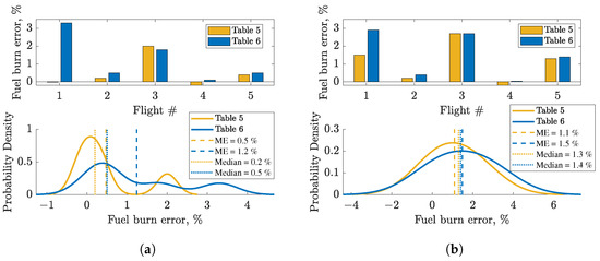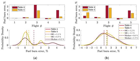 Figure 15. Comparison of fuel burn error for entire and clean trajectories from Table 5 and Table 6, represented as a bar chart and probability density using KDE. (a) Entire trajectory, Table 5 and Table 6. (b) Clean trajectory, Table 5 and Table 6.