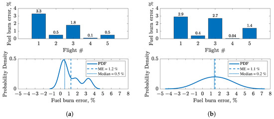To evaluate how the wind and ADS-B data affect the accuracy of fuel consumed, we studied the fuel errors for the most complete ADS-B trajectories. The fuel burns for the entire and clean flight segment are almost the same when comparing data from Table 5 (FDR weather and flight data) and data from Table 6 (ADS-B and ERA5 data), with a difference of less than 0.3%. This can be seen by comparing the relative errors of flights #2, #3, and #5 (Figure 15a). We can also observe that distributions for both data sources are positively skewed and that the same is valid for clean-phase fuel burn errors (Figure 15).