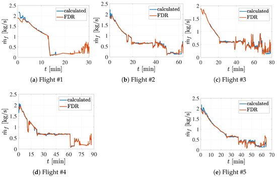 The method from [6,7] was used to validate the possibility of fuel consumption calculation using track data in [8]. Dalmau et al. [8] used 2248 commercial flights of Airbus-type aircraft from top of descent (ToD) to 5000 ft above ground level (AGL) to avoid problems with unknown configurations. The configuration was assumed to be clean. The authors extracted 4D track and weather data from available FDR records. They also used radar tracks for the same flight to compare the algorithm’s accuracy with data of lower quality. The comparison was made to assess the accuracy of the algorithm and to see if any discrepancies could be attributed to data quality. The initial mass was used as known data. Dalmau et al. [8] also used the BADA performance model and the aircraft performance model obtained from the performance engineer’s program (PEP) made available by the aircraft manufacturer. The authors used data filtering techniques to lower the noise due to the numerical derivation of aircraft states. Results for fuel burn with a PEP-derived performance model gave a relative mean error of 4.8% using the FDR track. In contrast, with the BADA performance model, the estimated fuel burn was 18.7% different from the actual fuel burn.