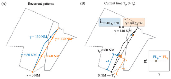 (A) Example of differences between patterns of the same flow. The same represents different geographical locations depending on the pattern. (B) Prediction when the flight has flown 60 NM ( is 60 NM) and the target point is at 140 NM.