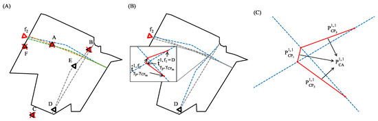 - Select those flights that have not reached any of their CA with ’s flow, i.e., flights whose . The flights that have already overflown the critical areas will not lose separation with . In the example of Figure 2A, B has already overflown CA.