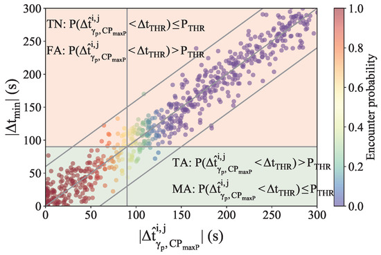 Based on the previous work of [23,24], when the prediction data follows a normal distribution centred around the prediction with its corresponding standard deviation , the encounter probability is defined as the probability of the time separation falling below .