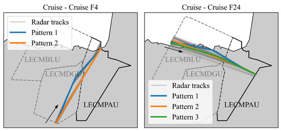 Regarding training, each identified traffic flow possesses its own predictor. As pointed out in [31], each flow exhibits recurring patterns—with the most commonly flown trajectories within it—with the planned route being one of them. Hence, it is worth noting that the same can refer to different geographic coordinates, depending on the specific pattern and flow that are being considered, as shown in Figure 1. However, for each recurrent pattern, the relation between the coordinates and is bijective.
