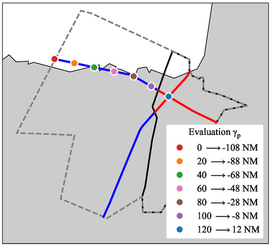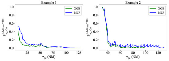 The CD performance variation due to the larger disparity of the predictors’ accuracy is assessed by comparing results at different evaluation points. As presented in Figure 13, the FA and MA proportions both decrease with an increase in . This reduction is caused by two factors. Firstly, a higher leads many flights to overfly the critical point, making the interaction impossible and consequently reducing the interaction sample size. Second, the uncertainty diminishes as increases, enhancing the accuracy of probability estimations and resulting in higher rates of True Positive (TP) and True Negative (TN). Figure 14 provides two flight pair examples, showcasing significant probability variation over , converting what initially appear as FAs and MAs into TNs and TAs, respectively. In the blue one, although it is a conflict-free flight pair, whose lies above = 30 s, the estimated probability at = −108 NM is relatively high at 0.61, making it possible to be notified and then classified as an FA. However, as the uncertainty decreases, this probability decreases to zero when reaches −28 NM, allowing the tool to accurately identify this case as conflict-free. The second flight pair presents the opposite case: a RP with an initial low estimated probability of 0.2 that escalates to 0.84 at = −8 NM, close to the sector boundary of PAU.