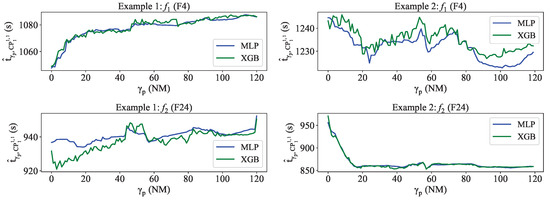 Although the overall deviation of the predictors is slightly lower in MLP-HTPs for F4 for low and , the low in XGB-HTPs for F24 compensates for the error and leads to a set of lower , as reflected in Table 5. As a result, the XGB-HTPs’ distributions exhibit a more pronounced slope than those of the MLP-HTPs.