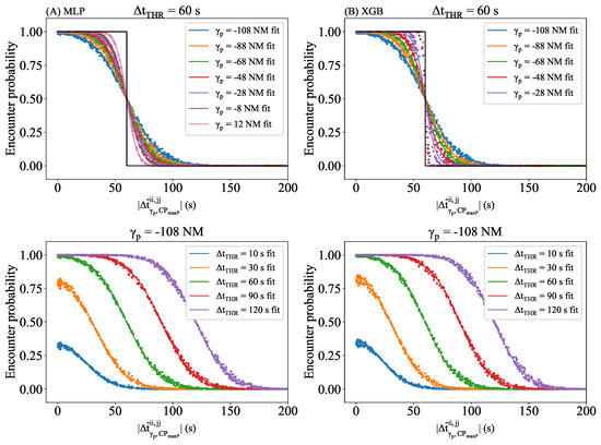 Regarding the variation by , all logistic fits intersect with the black step function, which represents the ideal CD performance, around a midpoint. At this intersection, the is approximately and the encounter probability is about 0.5. Due to the characteristic of the probability estimation formula, Equation (2) simplifies when , as shown in Equation (10), as follows: