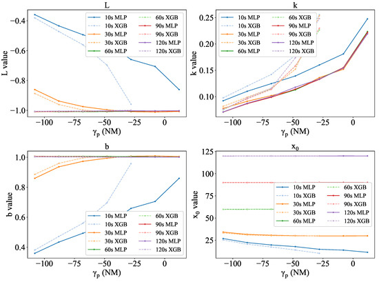 In Figure 12, the optimal values of L, k, and b are achieved in the CD tool for the values of 60, 90, and 120 s, and they remain constant. This constancy is because they all satisfy the condition of for any given , whereas for values of 10 s and 30 s, the parameters are far away from optimal. As uncertainty decreases with increasing , the parameters of these curves approach the optimal. Specifically, for 30 s, the SDR curve meets the optimal values for L, k, and b at −28 NM. For the same reason, the logistic parameters of CD using XGB-HTPs reach the optimal values earlier than those using MLP-HTPs.