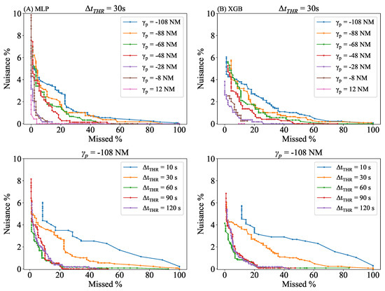 The resulting STE curves are presented in Figure 13. Each curve is composed of several points, which represent the proportion of nuisances and missed alerts for a given . The two graphs on the first row present the variation of the STE curves by for a fixed = 30 s, and the other two illustrate the variation by for a fixed = −108 NM. In this subsection, the selected is 30 s to visualise distinct variations, because it is the closest value to the maximum , as presented in Section 3.2.1.