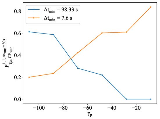 To check the condition, the highest of both flows for the first critical point are selected, which correspond to the prediction errors at their corresponding entry point (see Table 5). The of MLP-HTPs for F4 and F24 are 20.78 and 17.73 s, respectively, resulting in a (using Equation (4)) of 27.31 and . On the other side, the of XGB-HTPs are 21.15 and 15.56 s, respectively, resulting in . Thus, the results of both predictors reached a probability of one when the time separation equals 60 s. However, for a of 10 and 30 s, the maximum probability achievable is less than one, because , resulting in a distribution with a reduced maximum value.