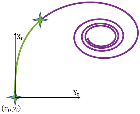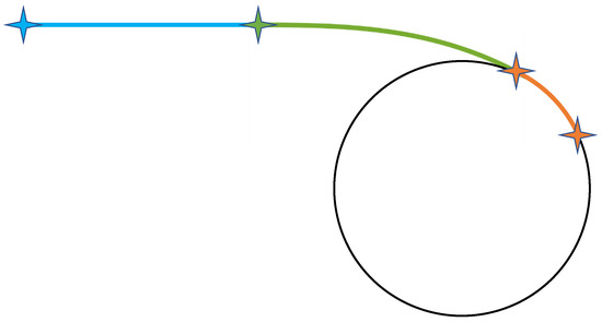 A clothoid or Euler spiral is a curve with the property that its curvature linearly increases with the arc length [17,18]. This makes the clothoid a particularly good candidate for transition segments that connect the straight line and circle as shown in Figure 1 where the straight line is shown in blue, the clothoid in green and the circular arc in orange and stars are delimiting different sections.