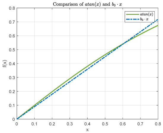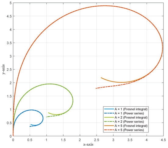 As shown in [15], the fifth-order power series is accurate enough for trajectory generation applications. A comparison of the exact representation and the approximation is shown in Figure 5. As we can see, the power series approximation is accurate even for extreme cases of a change in the angle of . Note that the clothoid shaping parameter A seen in Equation (32) simply controls the rate of growth of the clothoid curve.