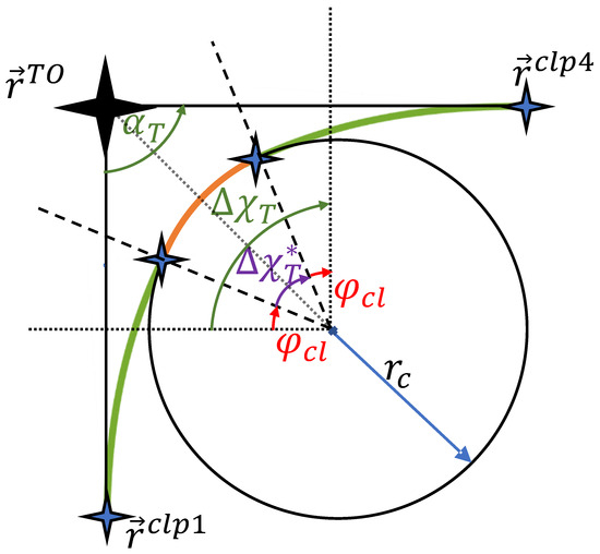 The flyby transition is mainly based on the developments in [15]. A geometrical overview is shown in Figure 6, where the clothoid segment is shown in green. The flyby transition has three segments: the turn-in, circle, and turn-out. In the horizontal plane, the turn-in and turn-out segments are clothoid sections and are assumed to be symmetrical. As introduced earlier in this paper, they are used to provide continuous curvature in the generated trajectory. In this section we want to derive the geometry of the maneuver as depicted in Figure 6 and use it, together with the relations derived in Section 2 for the three different segments (line, clothoid, circle), to derive an expression for the turn distance (see Figure 7) that only depends on the following parameters: