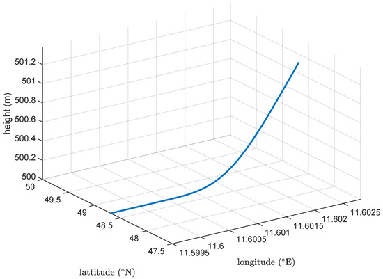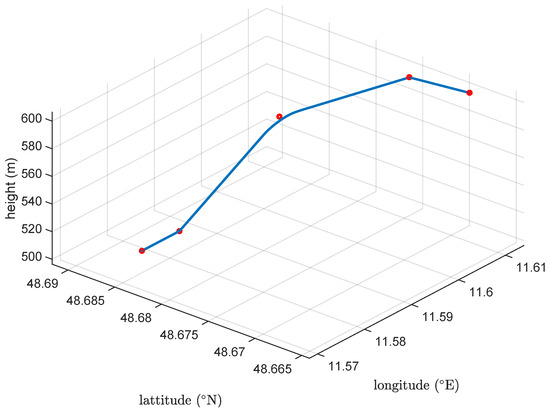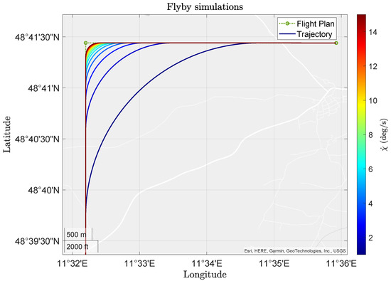 Schneider et al. [11,12] use line and circular arc segments to construct the trajectory. For the transition between segments, a clothoid function is used to ensure -order continuity of the trajectory. The clothoid function is designed based on the aircraft characteristics, namely the roll dynamics. While the approach is proven to work well for fixed-wing aircraft, flight path construction is more restrictive when considering eVTOL configurations. The clothoid-based approach is widely used for its simplicity and the system presented in [11] has been successfully flight tested on a fixed-wing aircraft [13].
