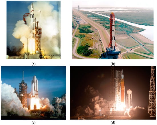 LH2 powered rockets. (a) The first successful launch of the Atlas-Centaur [source: https://www.nasa.gov/history/centaur-americas-workhorse-in-space/ accessed on 21 July 2023]; (b) the Saturn V used for Apollo 8 being transported to launch pad 39 A [7]; (c) the first flight of the space shuttle Columbia [8]; (d) I launch of Artemis I [source: https://www.nasa.gov/image-detail/amf-nhq202211160002/ accessed on 21 July 2023].