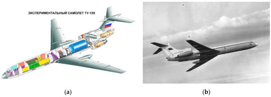 Tu-155 [10]. (a) Experimental airplane Tu-155—Cutaway diagram with the large cryogenic tank visible in the aft part of the fuselage in blue color and the LH2 powered starboard engine in dark orange; (b) the Tu-155 in flight.