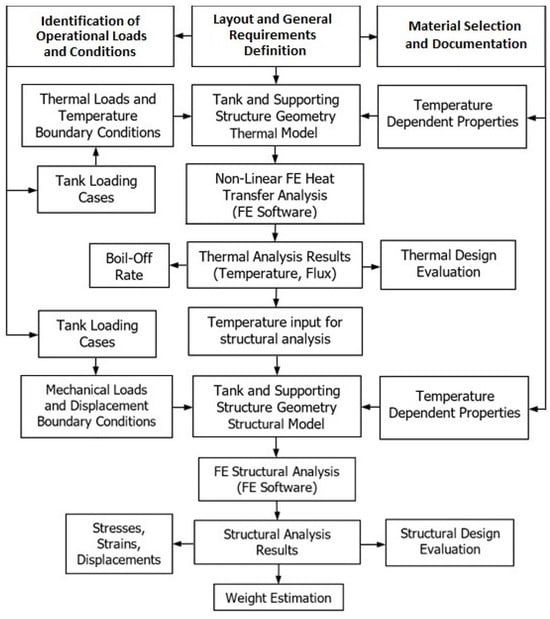 The design process begins with the definition of the layout and the general requirements of the tank. Parameters such as geometry, dimensions, capacity, insulation efficiency, and integration should be considered first. In the next phase, operational requirements such as storage pressure and limit loads should be defined. In this stage, several regulations should be considered, in order to size the structural elements of the tank accordingly. Materials are selected according to the general layout, operational conditions, manufacturing techniques, and availability. Adequate documentation regarding the mechanical and thermal properties of the materials is required for the operational temperature range in order to increase the accuracy of the simulations. With the conceptual design concluded, the development of the digital simulation may commence. Geometry, material properties, and structural details are introduced to the model in a parametric manner, allowing easy revision. The operational loads and conditions are also introduced in a parametric manner, allowing the investigation of the behavior of the tank under different load scenarios.