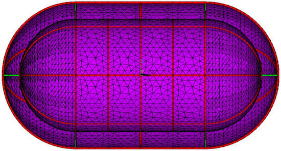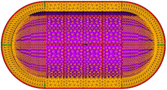 Thermal mesh. Stiffening structure elements in red; inner tank-supporting structure elements in green; Shell elements in purple.