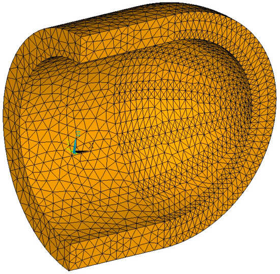 The insulation is meshed with tetrahedral options of 20-node coupled field higher-order solid elements, with displacement and temperature degrees of freedom activated, that are part of both structural and thermal analysis modules, as seen in Figure 5. Using the same elements for both modules allows the analysis to be conducted in systems with smaller memory capacity, at the expense of longer required time for the analysis process to conclude. A selection was made for 20-node solid elements instead of 8-node ones in order to increase the number of nodes for a more accurate through-the-thickness temperature distribution within the insulation, without increasing the number of elements.