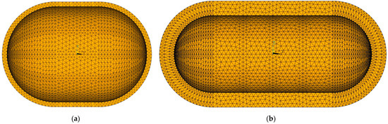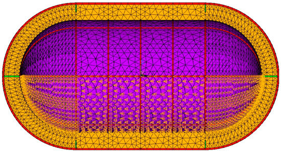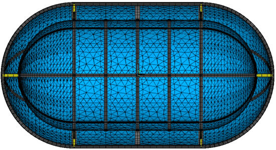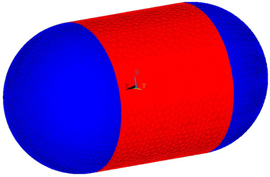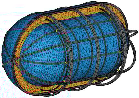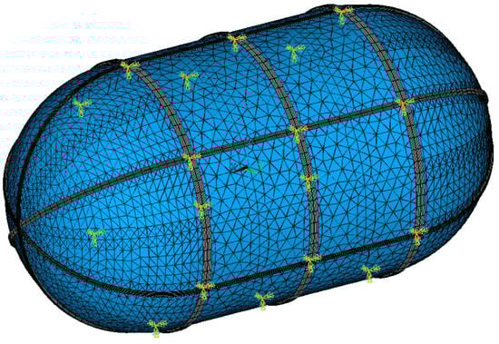 The non-linear heat transfer finite element analysis is the first module of the numerical model. The tank geometry is created by a parametric code, with design parameters such as diameter, length, insulation thickness, etc. being variables. The model supports any axisymmetric shape for the tank, yet in this case, a traditional pressure vessel geometry of a cylinder with two spherical domes will be modeled. The tank geometry is subsequently meshed with elements with temperature degrees of freedom. The tank walls are meshed using the triangular options of four-node thermal thin shell elements. Inner and outer wall areas are grouped separately, allowing meshing with different section types. The supporting structure beams are meshed with two-node thermal link elements. The beams are meshed by selecting specific lines of the geometry in a parametric manner. The inner tank-supporting structure tubes and rings made of PEEK are also meshed with thermal link elements. The cross-section area is a required input for these elements, and it has to be the same as the cross-section area of the beams used. The thermal mesh is presented in Figure 4.