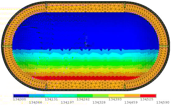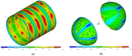 With the inner tank sizing process finished, the outer tank sizing process begins. The outer tank is sized with the same stress safety factor of 1.4 as the inner tank, leading to a maximum allowed stress of 143 MPa as no plastic deformation should be present, with the combined proof pressure, acceleration, and thermal loads applied. The outer tank is stiffened by three evenly spaced rings with an I cross-section. An overall depth of 50 mm, a width of 75 mm, and a thickness of 5 mm for elements are selected. The outer tank-supporting structure also includes six evenly placed longitudinal beams with an I cross-section with an overall depth of 50 mm, a width of 50 mm, and a thickness of 5 mm for elements. After an iterative process, a 14-gauge (1.63 mm) aluminum 2219 sheet is selected for the outer tank shell. Von Mises stress distributions for the combined loads are presented in Figure 21.