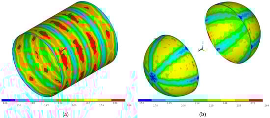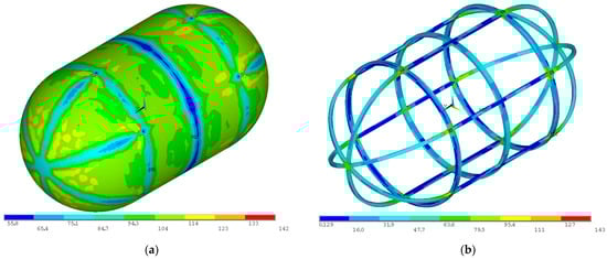 Von Mises stress distribution for the burst pressure combined loads on (a) the inner tank wall and (b) the inner tank-stiffening structure (units in MPa).
