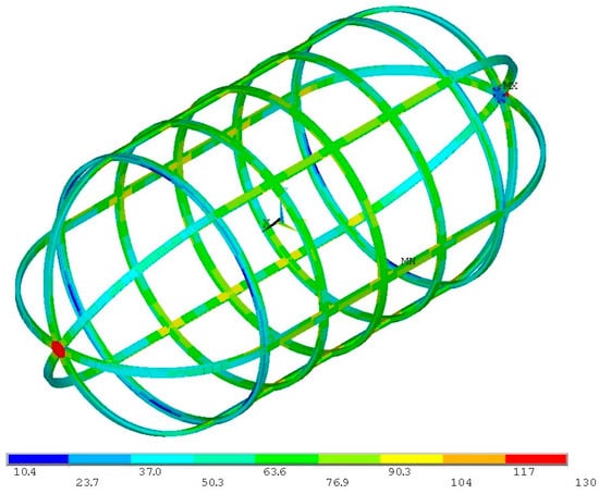 For the same load case, the inner tank-stiffening structure experiences a maximum stress value of 130 MPa, with the von Mises stress distribution presented in Figure 19.