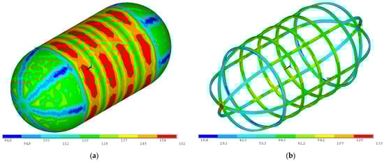 Von Mises stress distribution for the proof pressure combined loads on (a) the outer tank wall and (b) the outer tank stiffening structure (units in ΜPa).