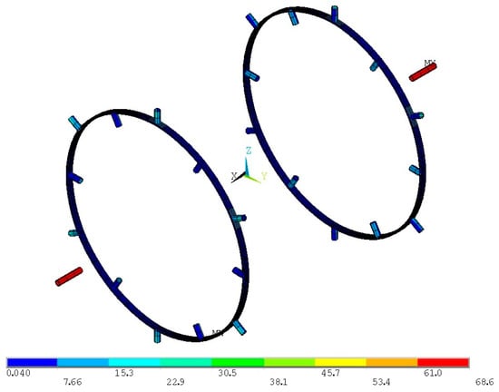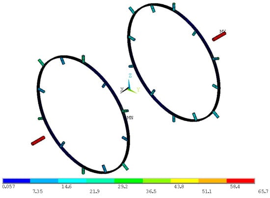 Stresses on the axial supporting tubes are within the limit, yet the radial supports experience low stresses. Therefore, the radial supports are reduced in size, with the I cross-section ring width of the flanges reduced to 40 mm and the thickness of the elements reduced to 2 mm, while retaining the 20 mm depth. The diameter of the axial tubes is reduced to 40 mm, while their thickness is reduced to 1 mm. Since the von Mises stresses on the axial supports is close to the limit value, the axial supporting tube thickness is increased to 3 mm in order to compensate for the overall reduction in stiffness of the radial supports. Von Mises stress distributions on the new supporting structure are presented in Figure 23.