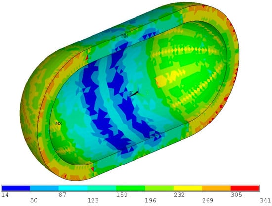 Von Mises stress distribution for the proof pressure combined loads on the inner tank-stiffening structure (units in MPa).