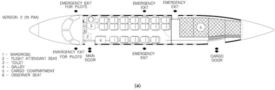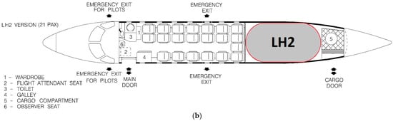 Fuselage layout of (a) Embraer EMB-120 Brasilia 19-seat combined cargo–passenger version [25]; (b) the proposed concept for an LH2-powered 21-seat commuter aircraft (adapted from [25]).
