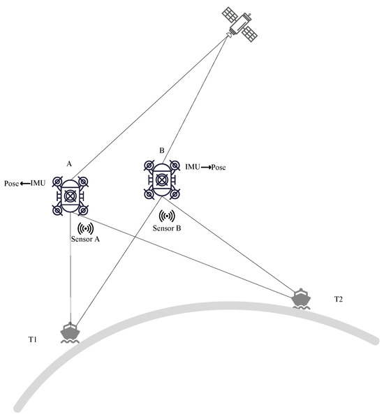 UAVs A and B detect the target in the designated sea area and find the sea targets T1 and T2. The simulated posture is shown in Figure 1. The observation information of UAVs A and B on sea targets T1 and T2 is , , , . The attitude information is , , and low-precision geodetic coordinate information is , , respectively.