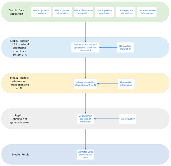 Firstly, the corrected geodetic coordinate information is obtained by error reduction based on the estimated geodetic coordinate systematic error , , , of the UAVs.