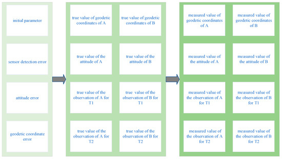 Where and are the geodesic coordinate systematic error scaling factor and attitude angle systematic error scaling factor, respectively, which are used to facilitate the adjustment of error variation in the simulation experiment. The flow of simulation data generation is shown in Figure 3.