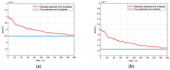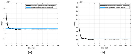 Figure 3 and Figure 4 show the relationship between estimated value of the geodesic coordinate systematic error and the true value of the geodesic coordinate systematic error of UAVs A and B. It is obvious that the estimated value of systematic error all converges to the true value. Table 5 shows the estimated error of the geodetic coordinate systematic error, which is already a small amount compared to the set true value. The systematic error reduction rate exceeds 70% in different platforms. It shows that the proposed geodetic coordinate systematic error estimation method is effective. The proposed geodetic coordinate systematic error estimation method estimated the systematic error by using EKF in essence. Therefore, the initial value of the system error should be set reasonably.