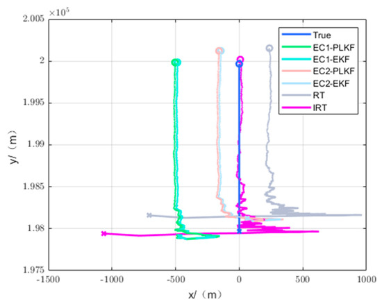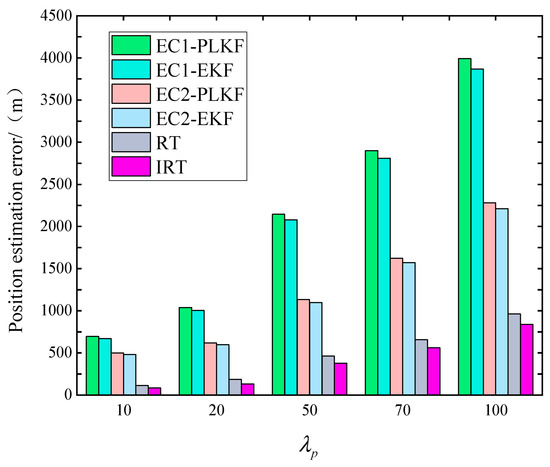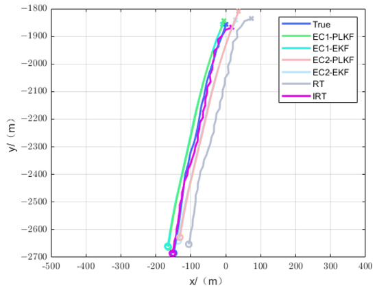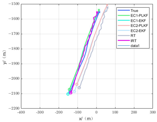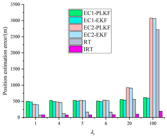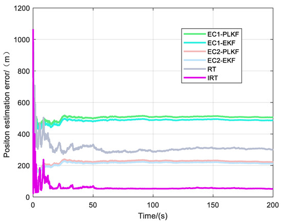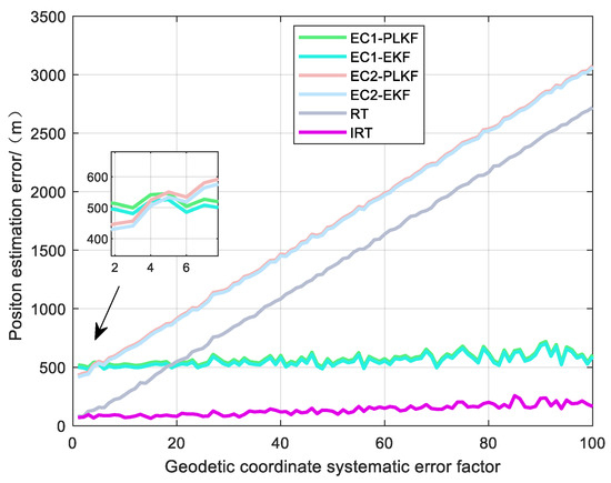Figure 8 shows that IRT, EC1-PLKF, and EC1-EKF can effectively suppress the effect brought by the error as the geodesic coordinate systematic error increases, while the error of EC2-PLKF, EC2-EKF, and RT keeps increasing. When is larger than 20, the tracking effect of EC2-PLKF, EC2-EKF, and RT starts to be worse than that of IRT because the influence of the geodesic coordinate systematic error on the target position estimation starts to dominate at this time.