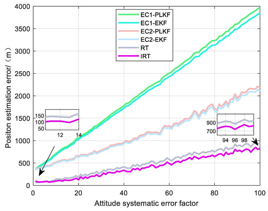 Figure 10 represents the variation of position estimation error for different algorithms as the attitude angle systematic error increases, where varies from 1 to 100 and , focusing on the effect of attitude angle systematic error on the tracking algorithm. Figure 11 and Table 9 reflect the position estimation error under typical attitude angle systematic error.