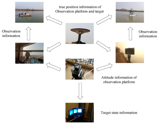 The experimental system consists of an information processor, YAR28(N) radar, Ku02 radar, combined navigation equipment, and RTK. Two small boats equipped with angular reflectors were used as targets in the experiment, and two radars were used to simulate two air platforms for cooperative observation of the targets. Figure 12 shows the experimental procedure. Table 10 shows radar-related parameters.