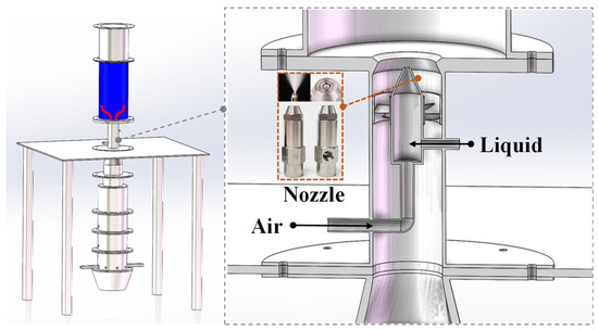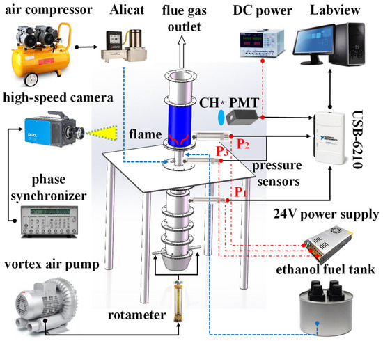 The combustion experiment of this research was conducted on a laboratory-scale ethanol atomization combustor. Detailed burner design characteristics and measuring instruments are displayed in Figure 1. In this research, the atomizing air of the ethanol nozzle is supplied with an air compressor (FREEMAN, PE20V15G), and the airflow rate was regulated with an Alicat gas flow meter (MCR-250SLPM). During the experiment, the ethanol flow rate and atomization airflow rate were kept constant to ensure that the burner thermal power remained constant. The air required for combustion is supplied by a high-pressure vortex air pump (PAMPAS, 250w), and the air flow rate was regulated with an Alicat gas flow meter (LZB-50, 16–160 m3/h). Ethanol used for combustion is supplied from ethanol fuel tanks, with a concentration of 99.95%. At the bottom of the burner, eight combustion air inlets are reserved. The combustion chamber is made of high-temperature-resistant and transparent quartz glass, with holes reserved for measuring the dynamic pressure of the combustion chamber.