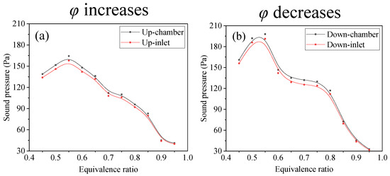 Effects of different flame equivalence ratio φ variation trends on the sound pressure amplitude in the combustion chamber and air inlet section; the φ varies from 0.45 to 0.95. (a) The equivalence ratio increases. (b) The equivalence ratio decreases.