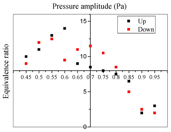Figure 3a,b also indicate that by optimizing the equivalence ratio of the actual ethanol atomization–combustion process, combustion instability can be effectively controlled. Although the variation trend in ethanol atomization flame equivalence ratio is different, the variation trend in combustion oscillation amplitude is relatively consistent. To further elucidate the variation pattern of sound pressure amplitude, the difference in sound pressure between the combustion chamber and the air inlet section is calculated and plotted. In Figure 4, it is found that a single hump-type curve can be obtained when the equivalence ratio gradually increases from 0.45 to 0.95. However, the variation curve presents a double hump-type curve when the equivalence ratio gradually decreases from 0.95 to 0.45. When the flame equivalence ratio φ is less than 0.8, the sound pressure amplitude difference between the combustion chamber and the air inlet section is greater than 8 Pa. When the flame equivalence ratio φ is greater than 0.8, the difference between the combustion chamber and the inlet section is less than 8 Pa. This also indicates that the higher of flame equivalence ratio, the lower the oscillation amplitude of ethanol atomization–combustion. Due to the hysteresis phenomenon of combustion oscillation, once the combustion oscillation is formed and then regulated by the change equivalence ratio, excessive adjustment of system parameters is required to exit the oscillation, which may cause mode transition of combustion oscillation. Every time the flame equivalence ratio is adjusted, it will wait for 3 min before starting to collect combustion oscillation parameters. It can be seen that the dynamic characteristics of combustion oscillations under different equivalence ratios are inconsistent; this is mainly due to thermal effects associated with changes in the equivalence ratio that increase/decrease the speed of sound in burnt gases, leading to increased/decreased oscillation frequencies.