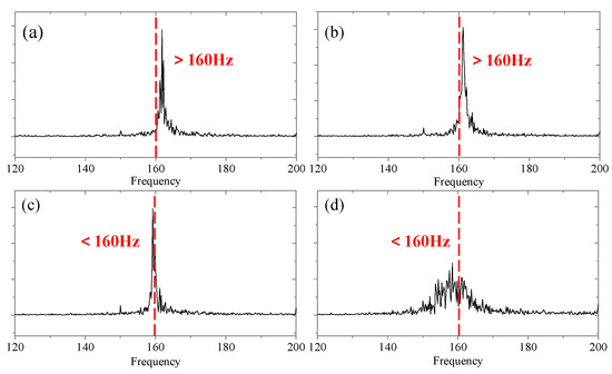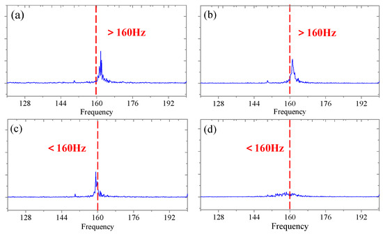 Similar to Figure 5, the detailed value of flame heat release rate oscillation frequency at several different equivalence ratios was displayed in Figure 8. To be consistent with the combustion conditions in Figure 5, four flame equivalence ratios were selected, φ = 0.45 in Figure 8a, φ = 0.60 in Figure 8b, φ = 0.75 in Figure 8c, and φ = 0.90 in Figure 8d. By performing FFT (fast Fourier transform) analysis on the obtained PMT (photomultiplier tube) time-series signal, the main oscillation frequency of heat release rate under different flame equivalence ratios was obtained. At the flame equivalence ratio of 0.45 and 0.60, the oscillation frequency of the CH* signal was 162 Hz and 161 Hz, respectively. In Figure 8a,b, the oscillation of flame heat release rate is all greater than 160 Hz. However, at the flame equivalence ratio of 0.75 and 0.90, the oscillation frequency of the CH* signal was 159 Hz and 156 Hz, respectively. In Figure 8c,d, the oscillation frequencies of the CH* signal were all greater than 160 Hz. At the same time, when the flame equivalence ratio is low, the main oscillation frequency of the CH* signal is more obvious, while when the equivalence ratio increases, the FFT results of the CH* signal show that the main frequency is no longer obvious, and the oscillation peak eventually disappears.